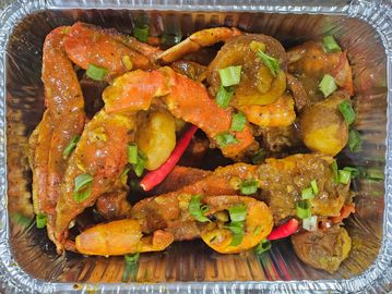 Fresh crab and juicy shrimp are simmered in a rich, golden curry sauce bursting with Caribbean flavor — made with garlic, thyme, scallions, and that signature blend of Jamaican curry powder. Every bite is bold, spicy, and buttery with just the right kick of heat. Served up food-truck style, it’s messy, flavorful, and downright addictive — perfect for seafood lovers who like it fiery and full of flavor!